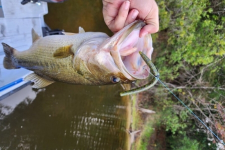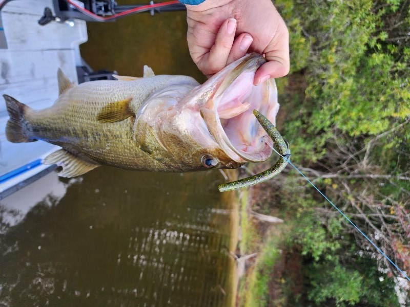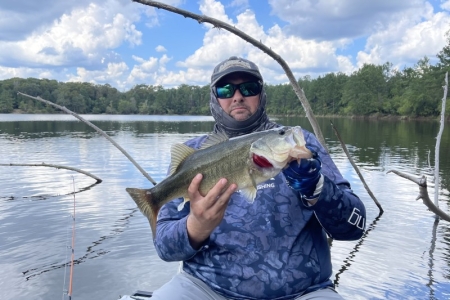 I’ll add to Jason’s report. I fished early near the shoreline with the wood. Started out with a bone colored popper but no luck. Picked up a wacky rigged Mardi Gras colored stick worm and nailed a good one near some structure. She was easy 4+ (no scale). Those fish fight hard and it took a while to get her to the boat. Continued with the wacky worm and caught several more including another 3+. Tried several moving baits without much luck. The few fish I could get to chase were on a 3-foot citrus shad crank, and had a couple of fish bite on a Sexy Shad colored Rat-L-Trap. They seemed to be short striking it and both on the trap came off at the boat. I suggest a stiffer rod if you are gonna crank in this pond. By mid-day I commited to deep cranking with 15+ feet cranks with no luck so I ended the day by 2PM with only 8 healthy fish with only 1 being a short cull. The side of the pond with the stumps along the shoreline seemed to produce best. Picked off a few under the floating pump on the opposite side. This pond has potential for some big fish. Lots of bait along the shore and all fish were fat. There are grass carp in here and a few gar.